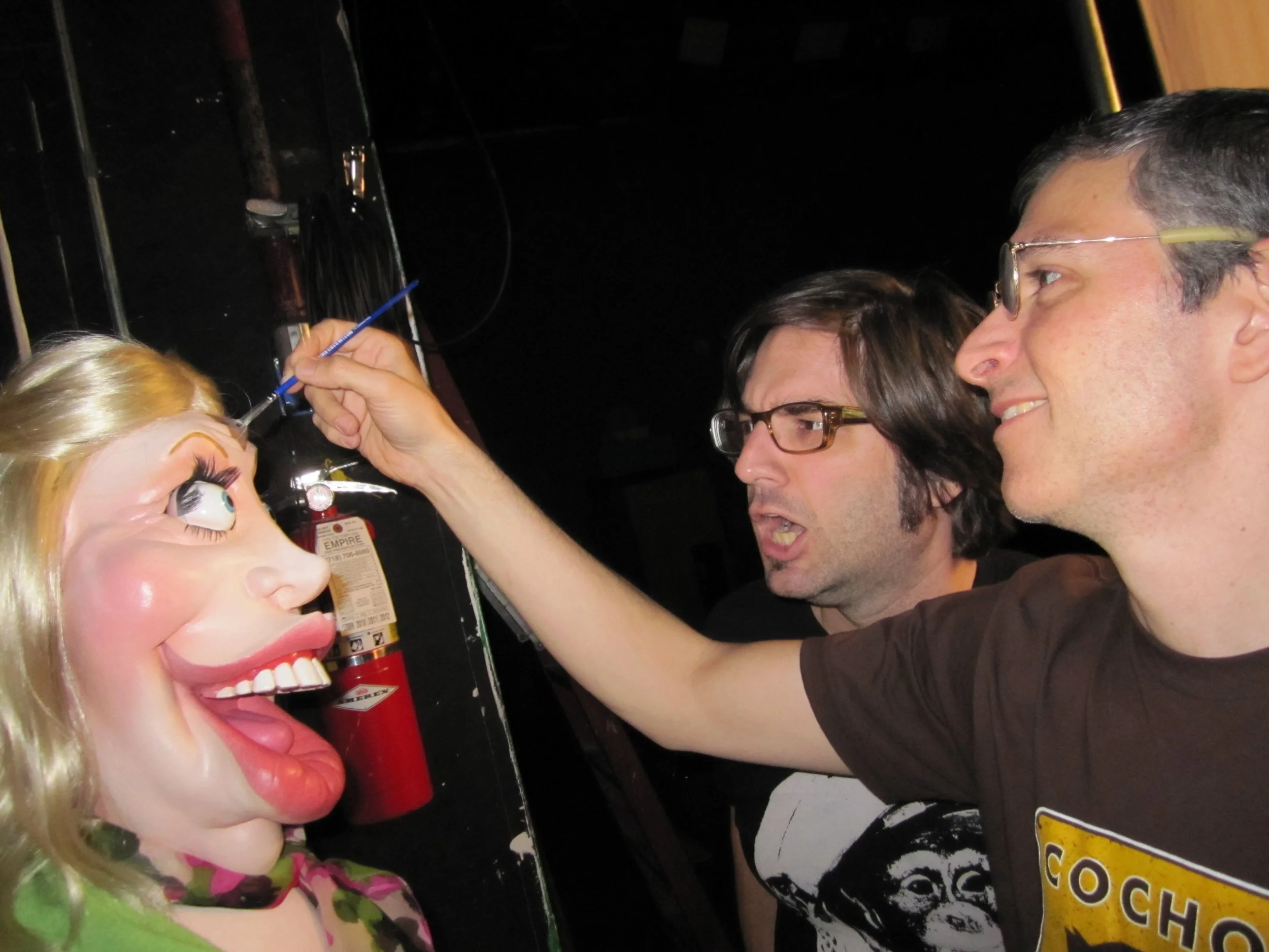 Puppeteer Tim Lagasse looks on in awe as wrangler Peter MacKennan touches up the make up of a puppet between takes.